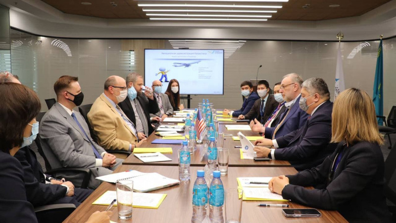 Состоялась встреча председателя Комитета гражданской авиации МИИР РК Талгата Ластаева, генерального директора Авиационной администрации Казахстана Питера Гриффитса со специалистами Администрации транспортной безопасности США (TSA) и экспертами Программы экспортного контроля и безопасности границ посольства США (EXBS).