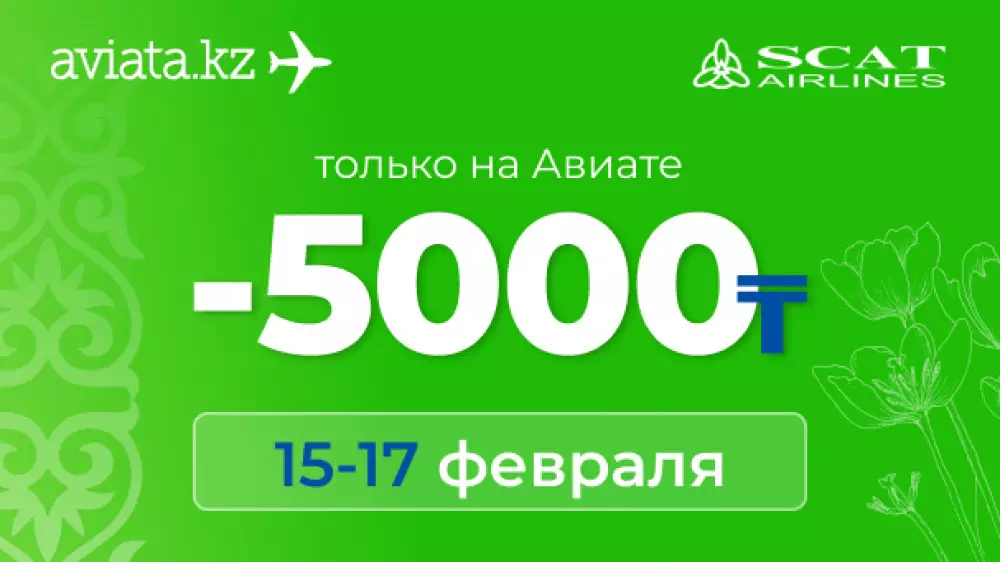 На Aviata.kz стартовала эксклюзивная акция! С 15 по 17 февраля авиабилеты SCAT со скидкой 5000 тенге. Акция распространяется на все направления авиакомпании, кроме субсидированных рейсов*.