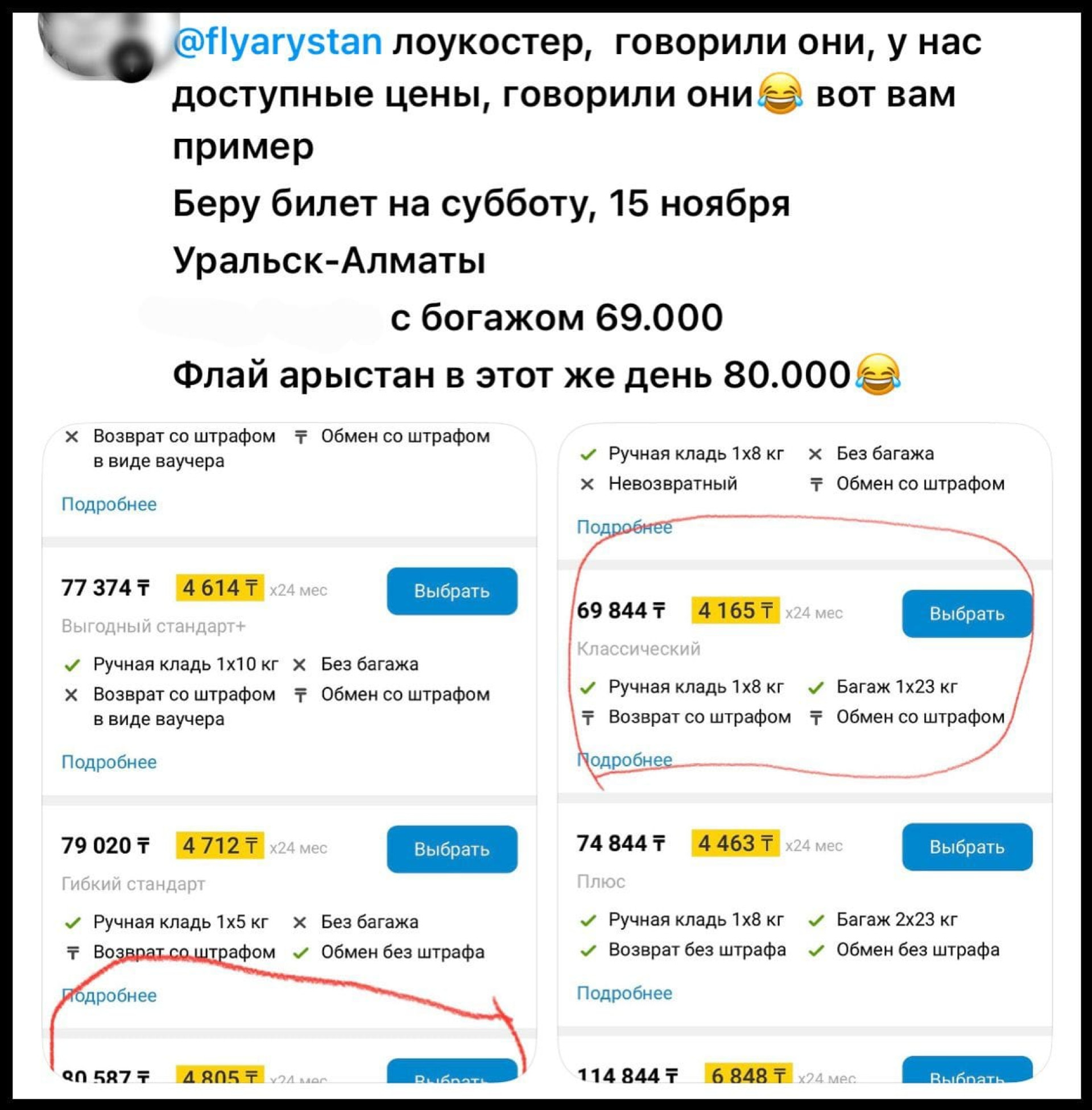 "Беру билет на субботу, 15 ноября, Уральск – Алматы Air Astana с багажом — 69 000 тенге, Fly Arystan в этот же день — 80 000. При этом Fly разрешает 20 килограмм багажа, Air Astana — 23! Почему, когда речь о ценах, им можно, а как говоришь о сервисе — сразу лоукостер?" — поделилась она.