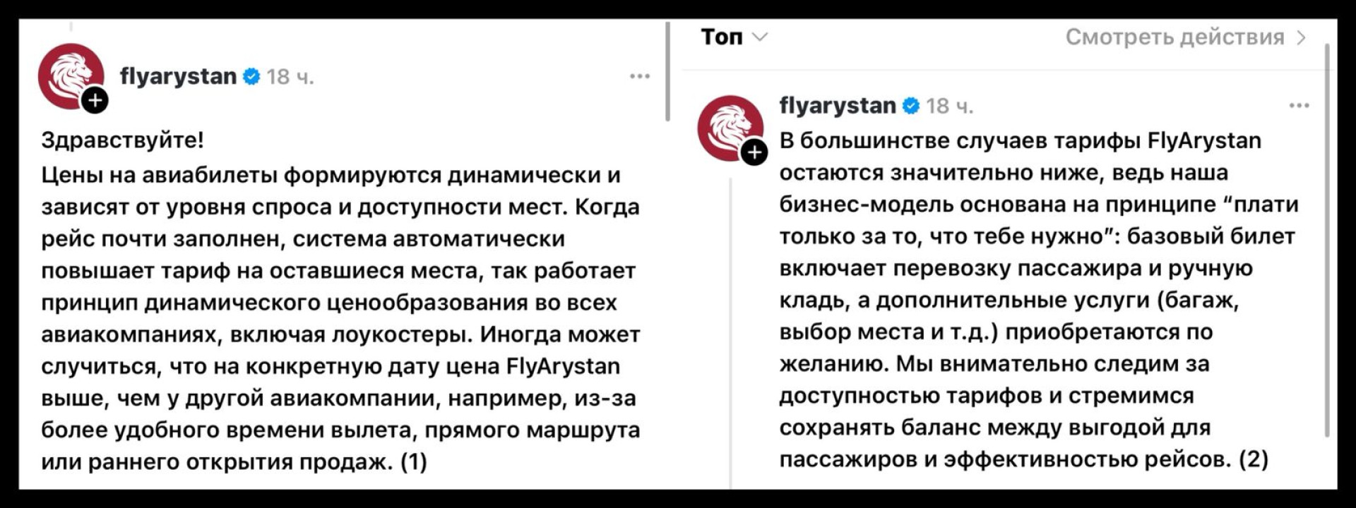 К слову, в марте этого года FlyArystan заметили в незаконных наценках: АЗРК выявило скрытые доплаты и так называемое капельное ценообразование (drip pricing). Агентство выдало компании уведомление о прекращении нарушения антимонопольного законодательства, которое было исполнено.