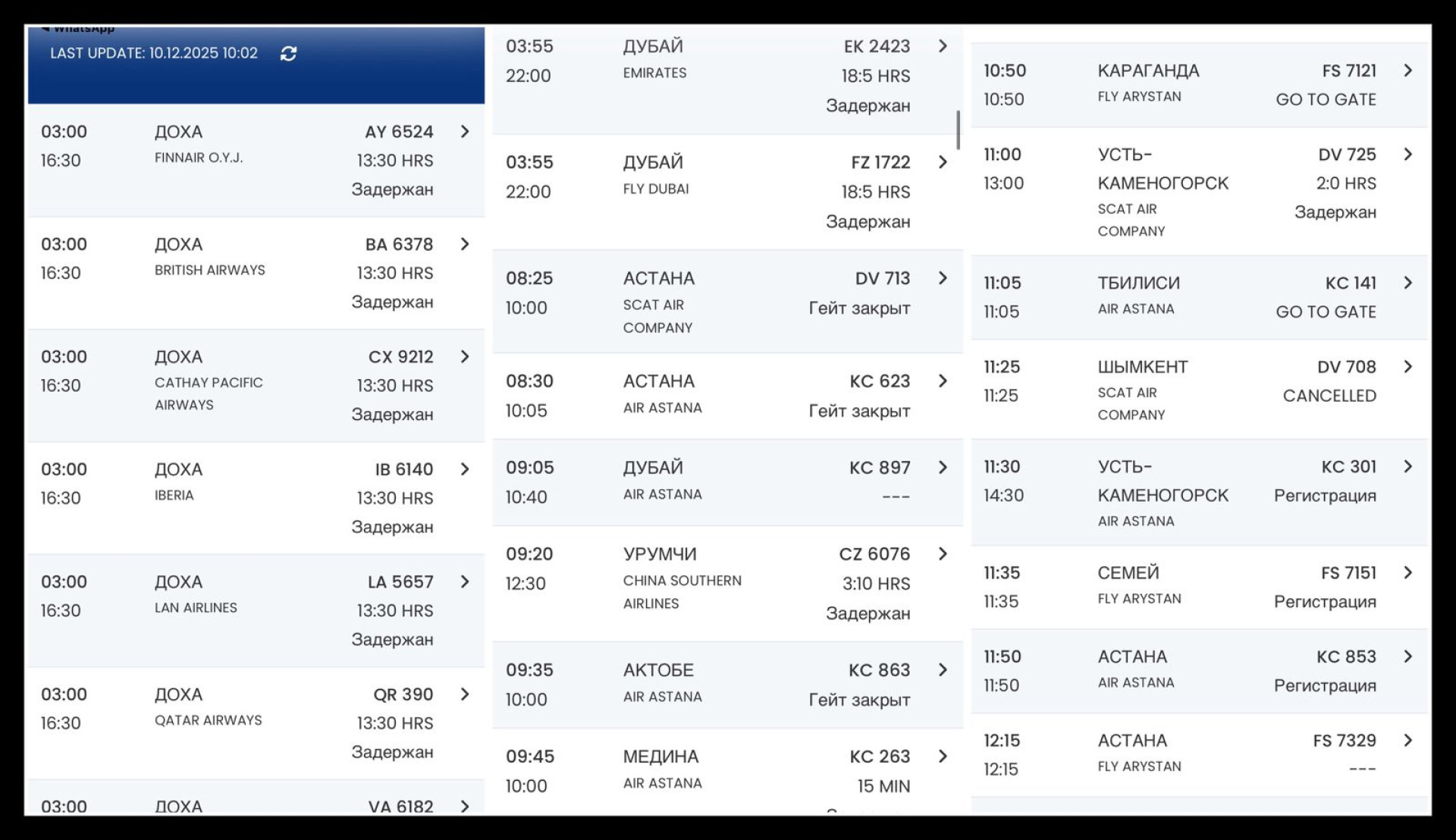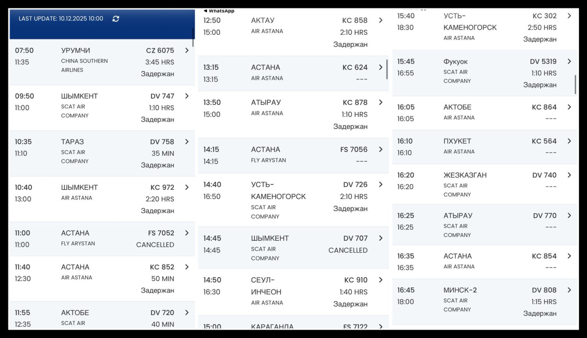 - Air Astana, KC 8783 (Атырау) — задержка 1 час 10 минут;