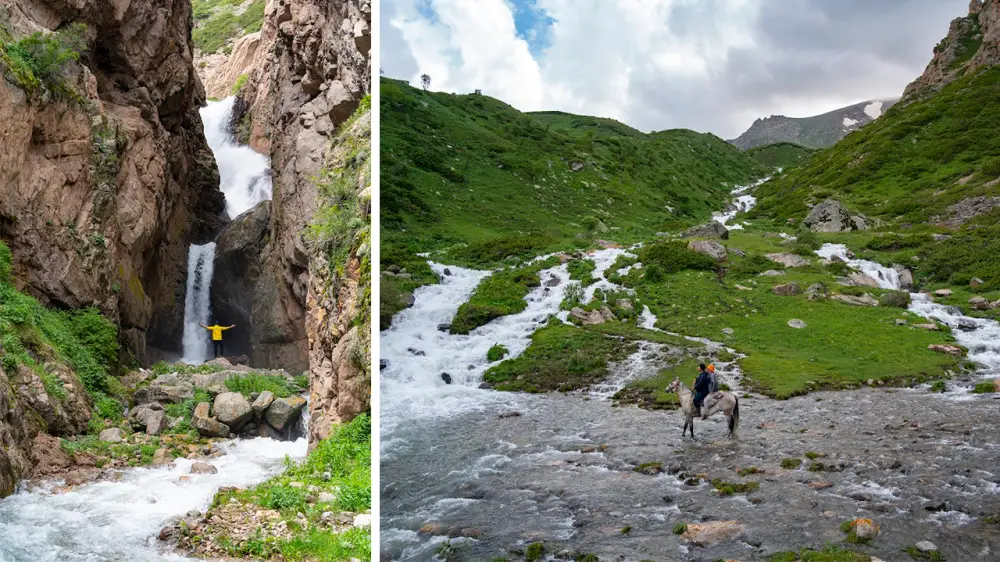 Ущелье Сарыбел — воплощение уюта и природной гармонии. Расположено оно недалеко от города Жаркент, что делает его легкодоступным для горожан и туристов. В отличие от суровых скалистых каньонов, Сарыбел встречает гостей мягкими, бархатными склонами, покрытыми густым ковром разнотравья, высокими елями и стройными соснами. Это идеальное направление для экотуризма, семейных пикников и конных туров. Весной ущелье преображается, словно укутываясь тысячами тюльпанов и горных цветов.