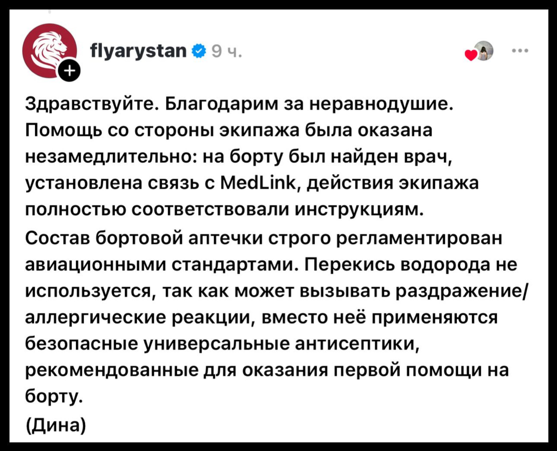 "Помощь со стороны экипажа была оказана незамедлительно: на борту был найден врач, установлена связь с MedLink, действия экипажа полностью соответствовали инструкциям", — ответила авиакомпания под постом.