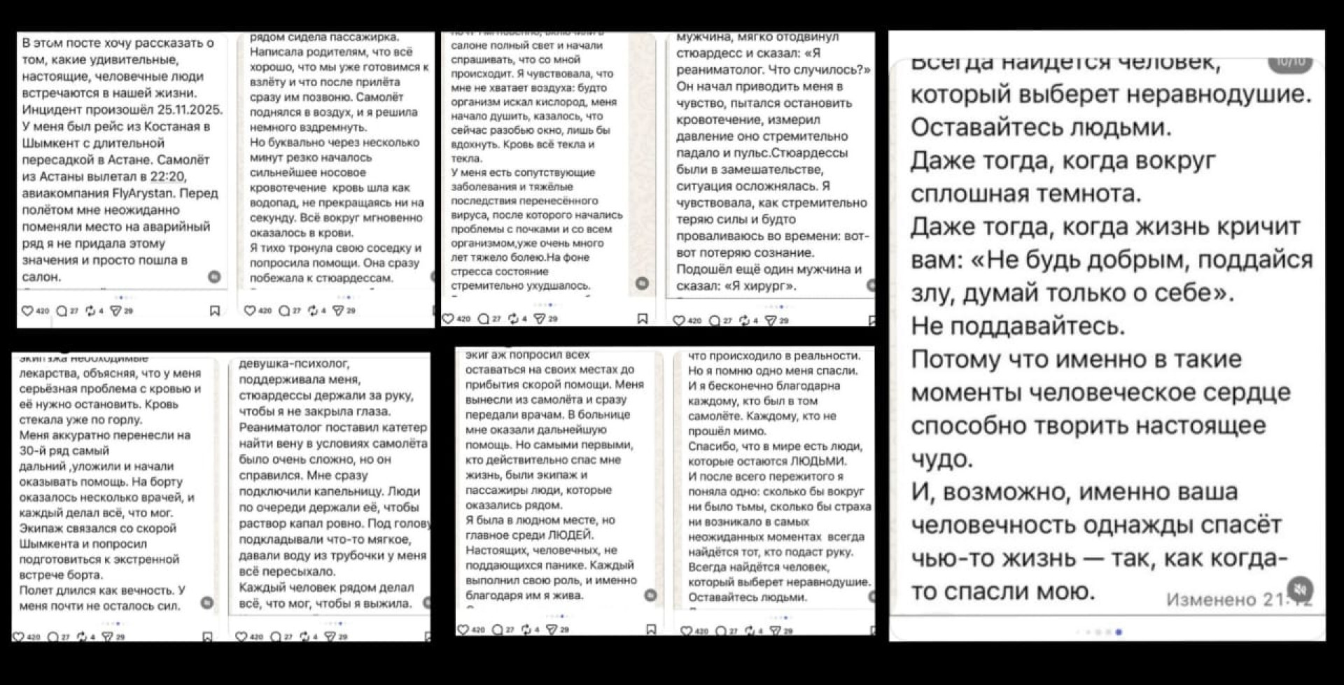 "Самолёт из Астаны вылетал в 22:20. Я решила немного вздремнуть после взлёта, но через несколько минут у меня резко началось сильное кровотечение. Кровь шла как водопад, не прекращаясь ни на секунду. Всё вокруг мгновенно оказалось в крови", — говорится в публикации.