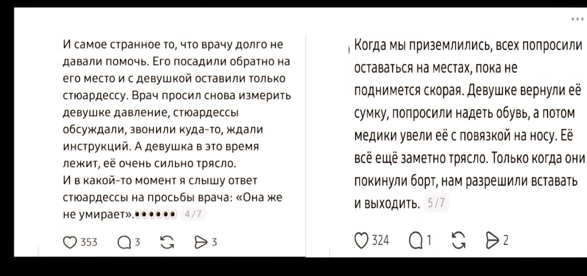 "Аптечку приносят, но, как я понимаю, она оказалась бесполезной. Врач сделал ей повязку на нос и спрашивал у стюардесс про перекись водорода. Ни перекиси, ни чего-то подобного в аптечке не оказалось. Самое странное — врачу долго не давали помочь. Его посадили обратно на его место, а с девушкой оставили только стюардессу. Врач снова просил измерить ей давление, стюардессы обсуждали, звонили куда-то, ждали инструкций. А девушка в это время лежала, её сильно трясло. И в какой-то момент я слышу ответ стюардессы на просьбы врача: "Она же не умирает", — отметила автор поста.