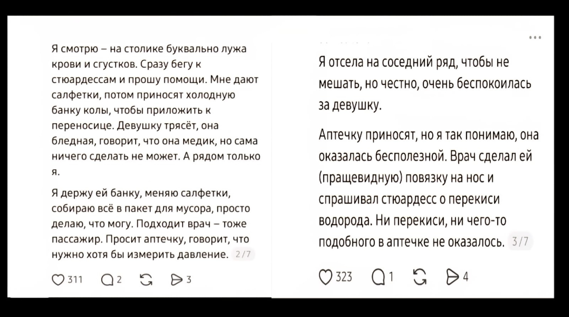 "Меня аккуратно перенесли на 30-й ряд, уложили и начали оказывать помощь. На борту оказалось несколько врачей, каждый делал всё, что мог. Люди по очереди держали капельницу, подкладывали под голову мягкие предметы, давали воду", — добавила пассажирка.