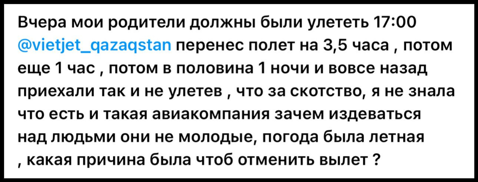 "Авиакомпания несколько раз переносила рейс — сначала на 3,5 часа, потом ещё на 1 час, а в итоге в 00:30 рейс вообще отменили, и они вернулись домой, так и не улетев. Что за безобразие? Я не знала, что есть такая авиакомпания. Зачем издеваться над людьми, они немолодые, погода была летная. Какая причина отмены рейса?" — рассказала она.