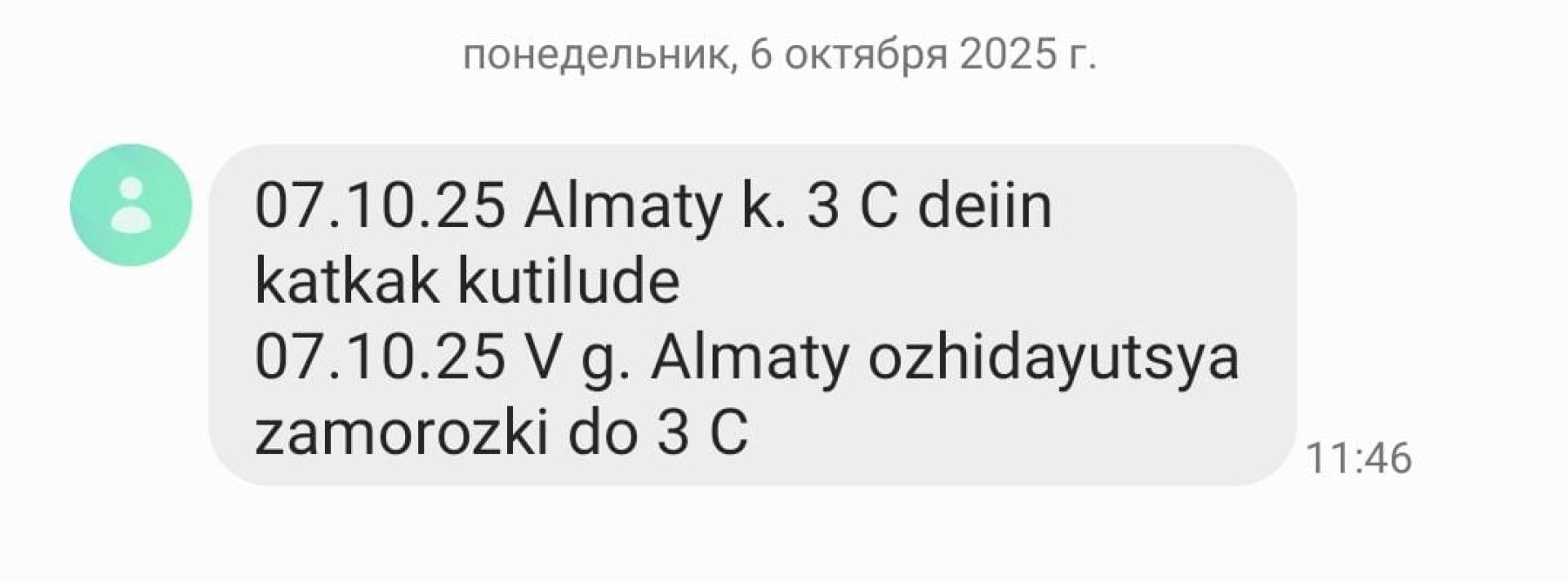 Тем временем 7 октября в Алматы ожидается переменная облачность, без осадков. Ночью ожидаются заморозки до минус 3 градусов, днём до плюс 16 градусов.