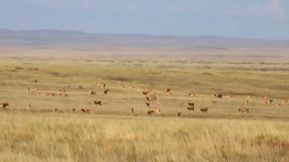 Житель Казахстана снял на видео большое стадо сайгаков, стремительно бегущих по степи в Карагандинской области. Животные свободно перемещались по просторной территории, создавая завораживающее зрелище, передаёт Tengri Travel.