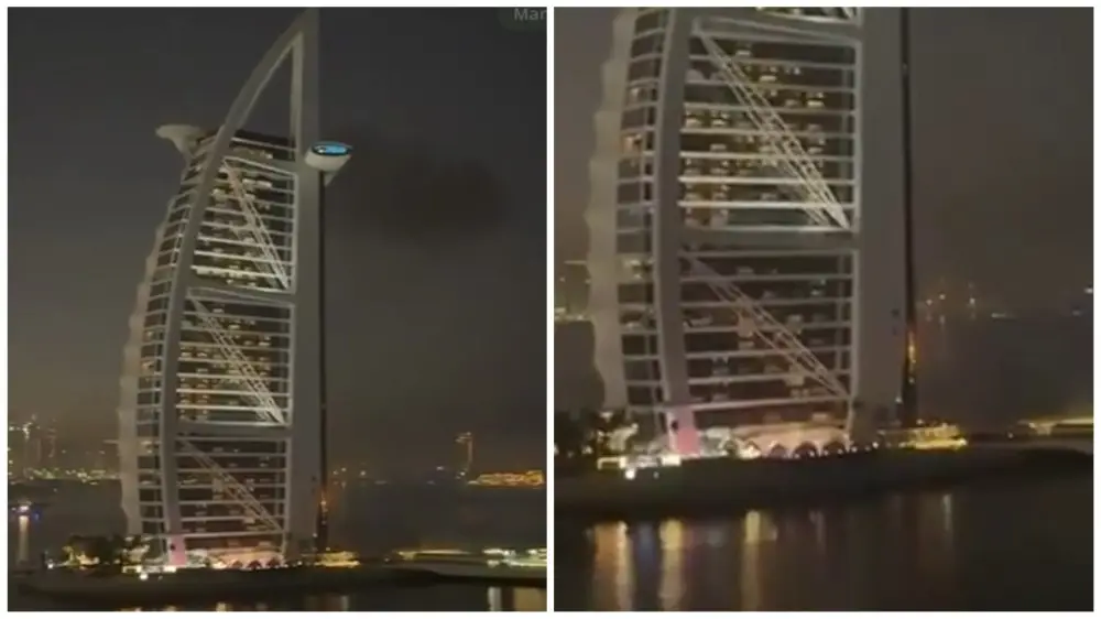 Иранское информационное агентство Tasnim сообщает о том, что на нижней площадке отеля, имеющего форму парусника, начался пожар после удара дрона.