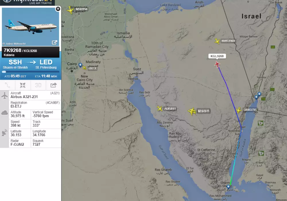 На месте крушения Airbus A321 в Египте нашли тела 100 человек - СМИ Маршрут потерпевшего крушение лайнера Airbus A-321. Фото с сайта flightradar24.com