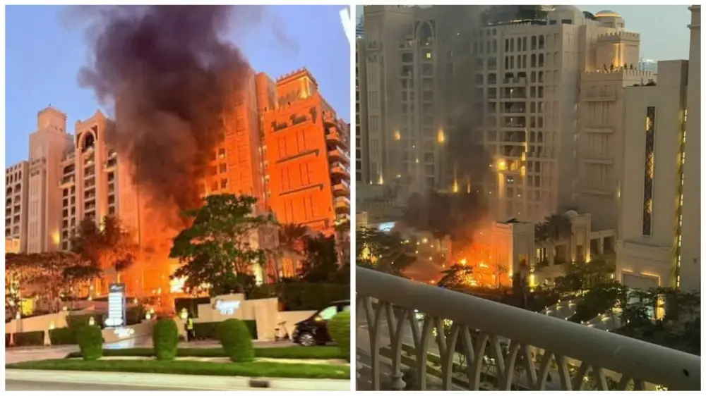 "Top Dubai hotel on Palm Jumeirah in flames after being hit by missile debris from Iran blitz."