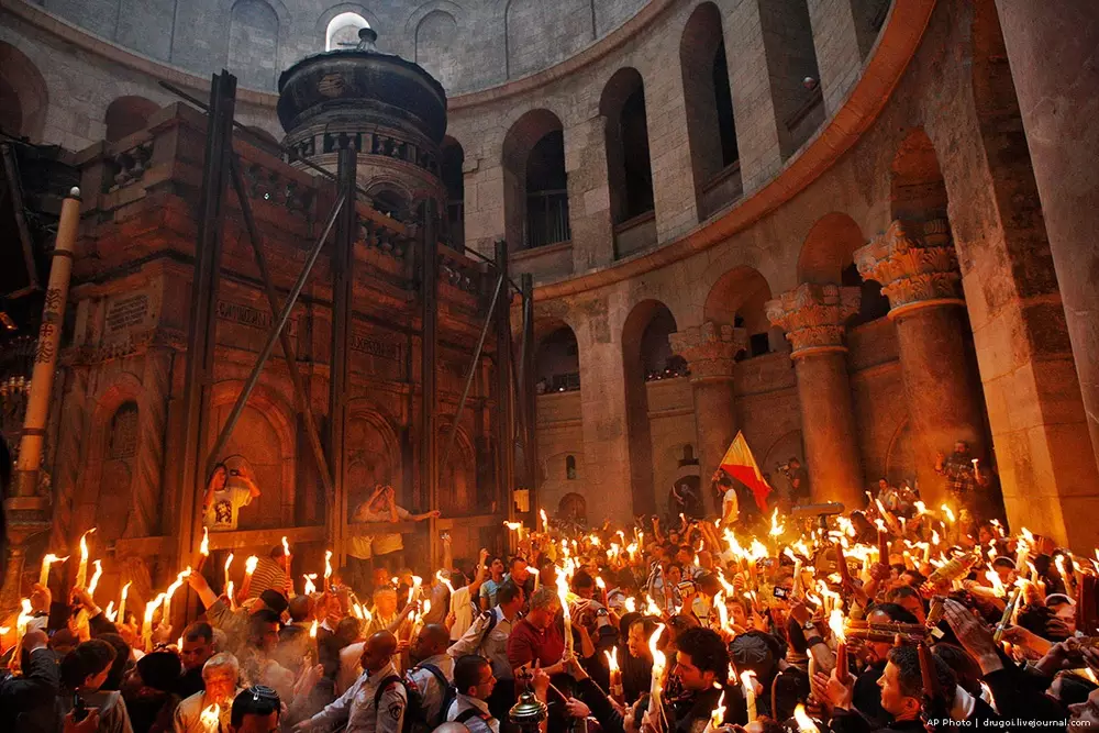 Огонь возгорелся чудесным образом в кувуклии - часовне внутри храма. Благодатный огонь появился в ответ на молитвы патриарха Иерусалимского Феофила и тысяч паломников, собравшихся в этот день в храме Гроба Господня и на прилегающих к нему улицах.