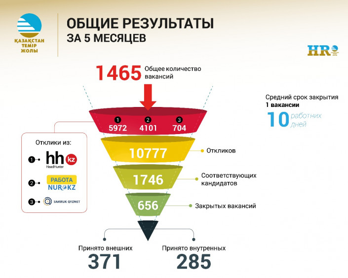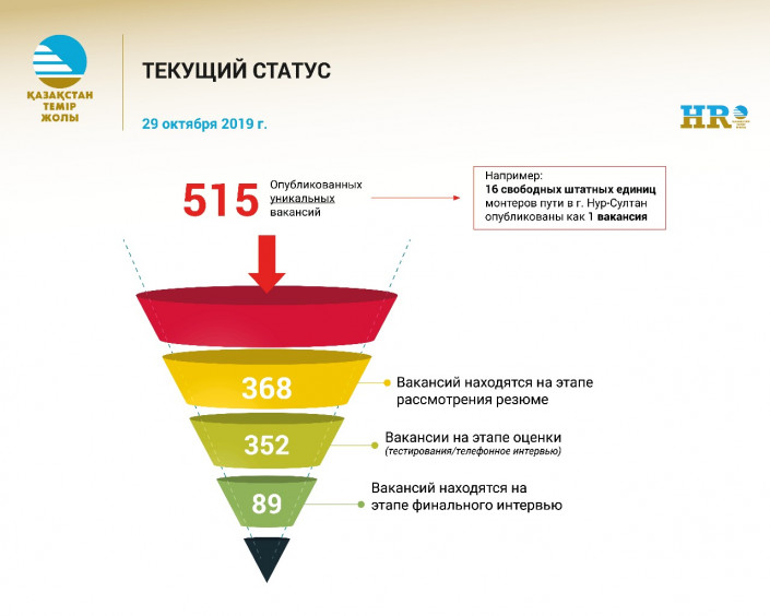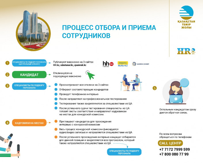 Проект по прозрачному найму персонала состоит из нескольких этапов. Кандидат должен направить свой отклик на свободную вакансию. После первичного интервью он направляется на тестирование. Шорт-лист соискателей, прошедших все этапы отбора на центральном уровне, передается конкурсной комиссии, организованной кадровыми службами в регионах. Квалификационная проверка и оформление на работу осуществляются через единый многофункциональный центр обслуживания при департаменте кадрового администрирования АО "НК "ҚТЖ".