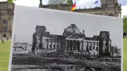 "Это королевская площадь, Берлин. 69 лет назад здесь шли ожесточенные бои за взятие Рейхстага. На этом самом месте находилась штаб-квартира министерства внутренних дел, в котором участники 150-й стрелковой дивизии находились после ожесточенных боев с большими потерями, взяв ее. Среди них находились Рахимжан Кошкарбаев и Григорий Булатов. Они получили приказ поставить флаг над главным входом Рейхстага. Это расстояние в несколько сот метров. Изрытая, израненная, обильно политая кровью павших советских солдат, оборонявшихся от фашистов. Это расстояние они ползли больше 7 часов. Как вспоминал сам Рахимжан аға, они ползли по трупам. В одной из воронок Рахимжан аға достал химический карандаш, и они вместе с Григорием Булатовым на флаге написали свои имена и водрузили вон там, у главного входа. Это был первый флаг, который появился на здании Рейхстага 30 апреля. Этот флаг стал началом взятия Рейхстага", - комментирует видео Батыр Казыбаев, рассказывая о важнейшем событии Великой Отечественной войны.