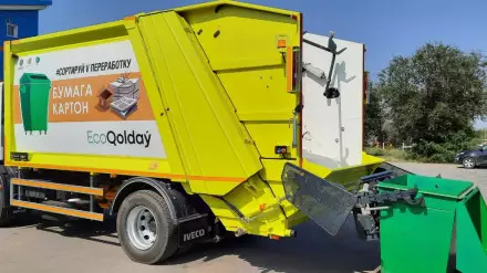 Вывозить вторичное сырье на переработку будут 6 отдельных мусоровозов, два из них, с крано-манипуляторной установкой, будут обслуживать синие контейнеры для отходов стекла. Все закупленное оборудование передано акимату Актобе.
