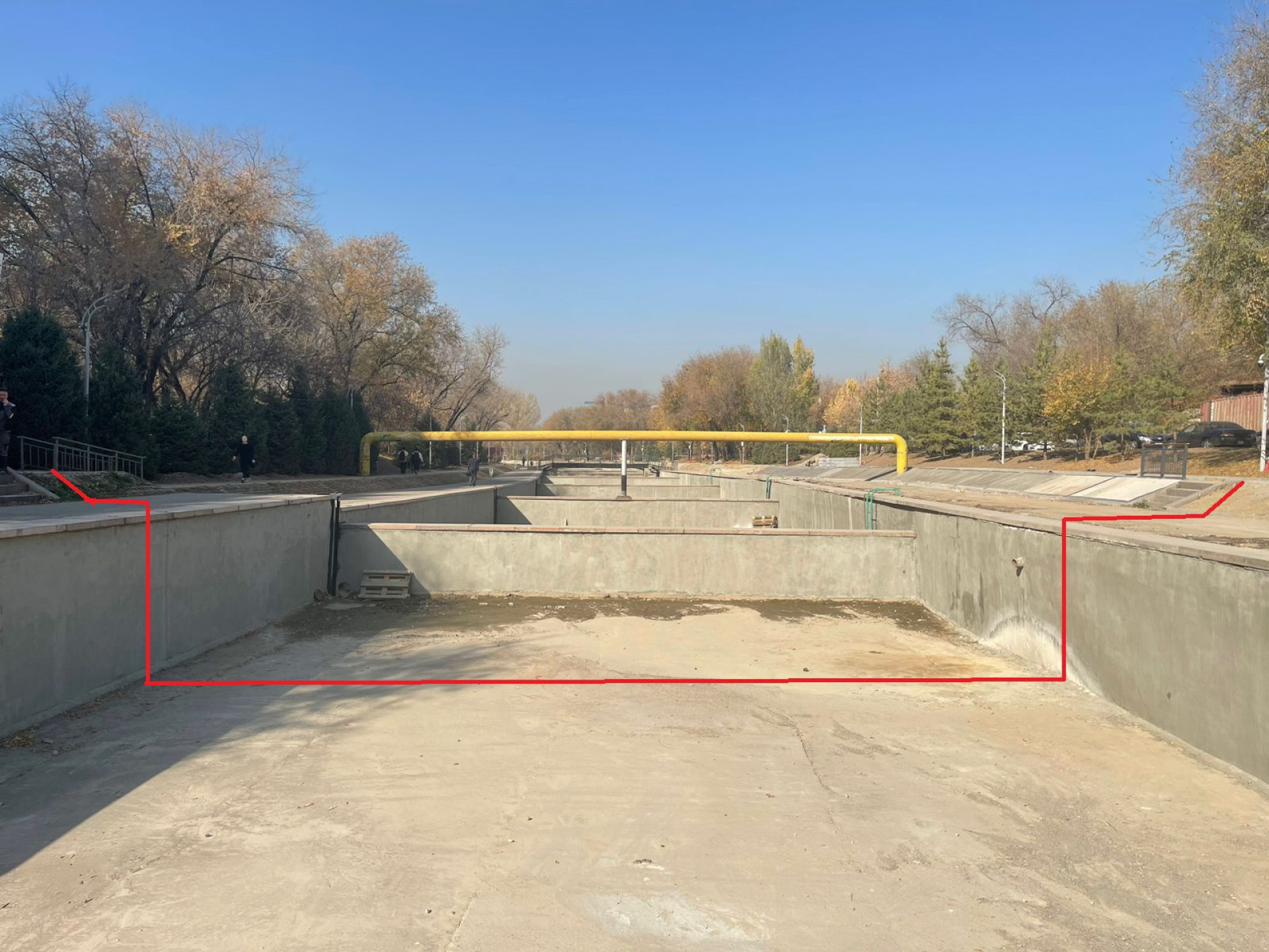 "На изображении красным цветом обозначены границы максимально прогнозируемого потока - именно в этих пределах должен сохраняться основной гидравлический профиль русла. Чтобы обеспечить устойчивость и безопасность, проектом предусмотрено укрепление откосов монолитным бетоном, устойчивым к размыву и динамическим нагрузкам", – пояснили в акимате.