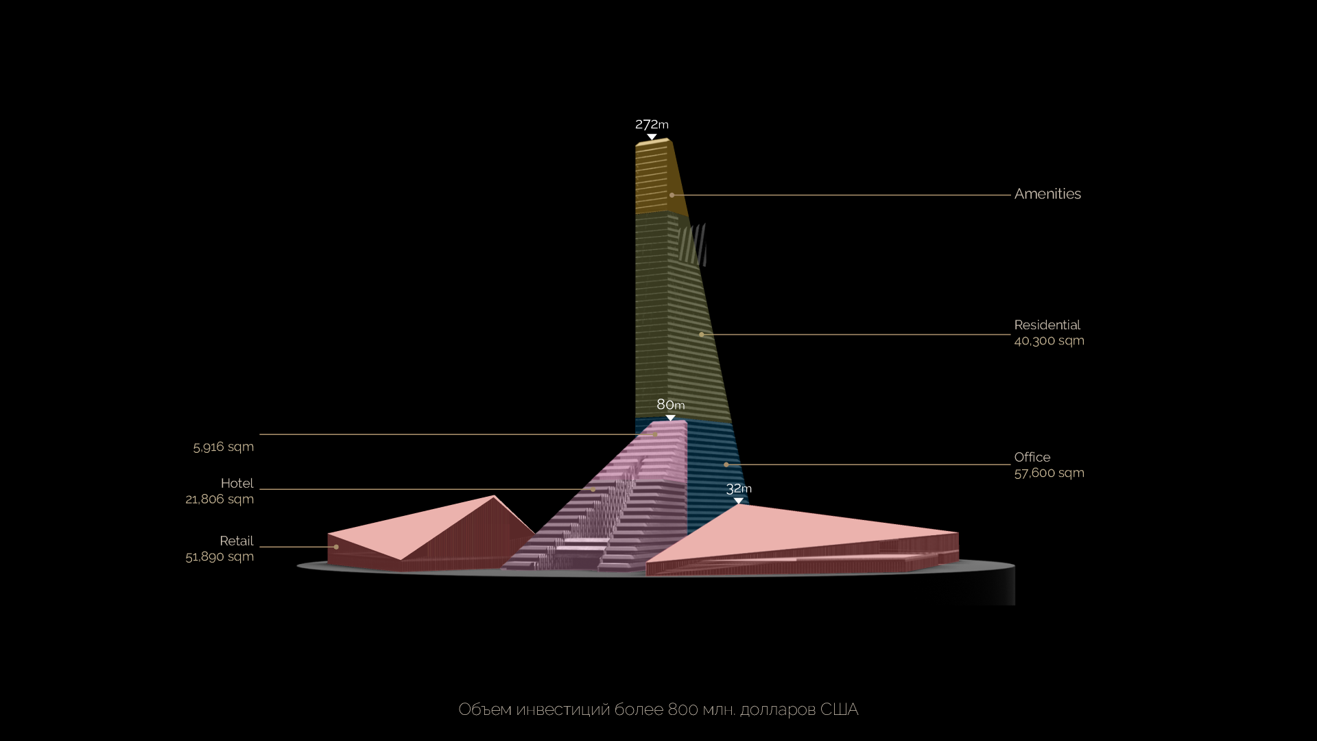 Общая площадь здания составит 276,8 тысячи квадратных метров. В основании небоскреба расположится трехэтажный подиум с культурными пространствами и торгово-развлекательным центром площадью 58 тысяч квадратных метров.