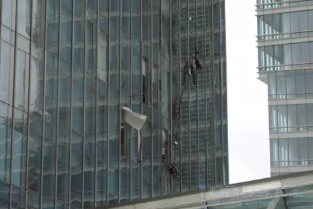 Четыре мойщика стекол на высотных зданиях Алматы сегодня оказались в ловушке ветровых порывов и грозовой атмосферы, сообщает Today.kz. Страховочный трос, на котором они держались, оторвался от одного из соединений - в результате трос вместе с людьми болтало из стороны в сторону на протяжении долгого времени.