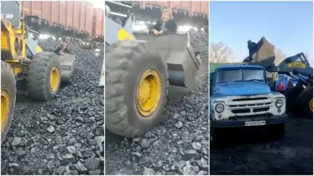 В социальных сетях появилось видео, где женщина забралась в ковш погрузчика, в котором был уголь. При этом погрузчик, словно не замечая женщину, продолжает свою работу.
