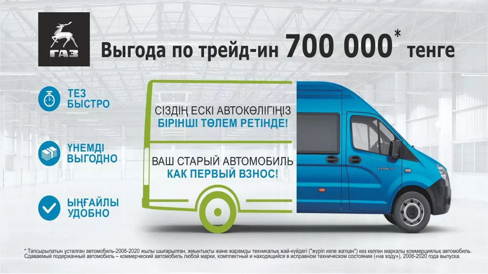 Для тех, у кого имеются старые автомобили, стоит рассмотреть программу Trade-in. Она позволяет обменять ваш автомобиль на новый. Для этого в дилерском центре ГАЗ могут провести онлайн-оценку старого автомобиля и помогут оформить документы. Поскольку обмен автомобиля проводится в дилерском центре, это гарантирует юридическую чистоту сделки. Выгодный обмен на новые и зарекомендовавшие себя грузовики ГАЗ или автобусы Газель City позволит вам получить выгоду в 700 000 тенге.