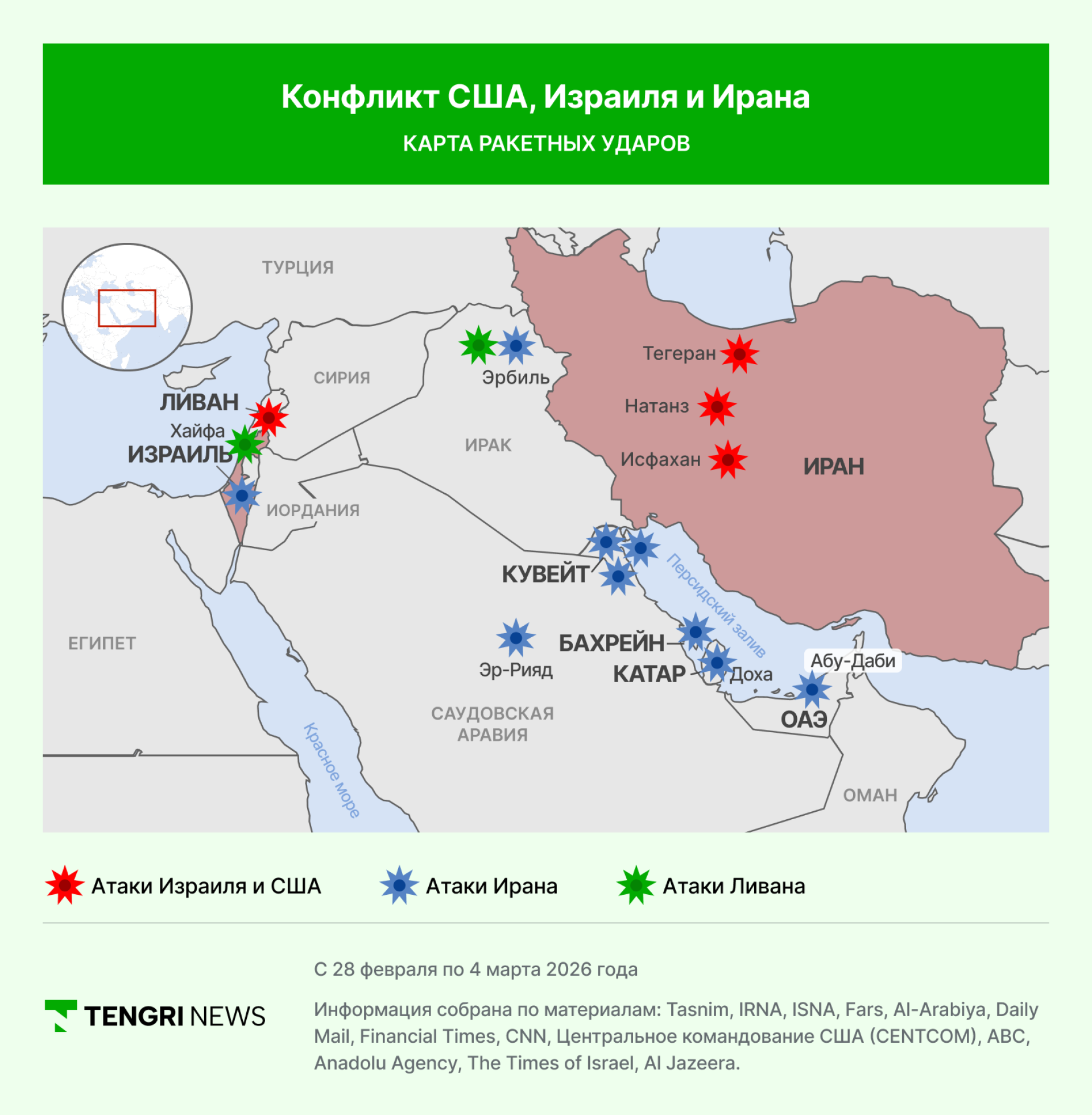 28 февраля Израиль и США начали масштабную военную операцию против Ирана. В результате атак погиб верховный лидер страны Али Хаменеи. В ответ Иран начал удары по Израилю и по военным базам США в других странах Ближнего Востока. Tengrinews.kz собрал хронологию событий.