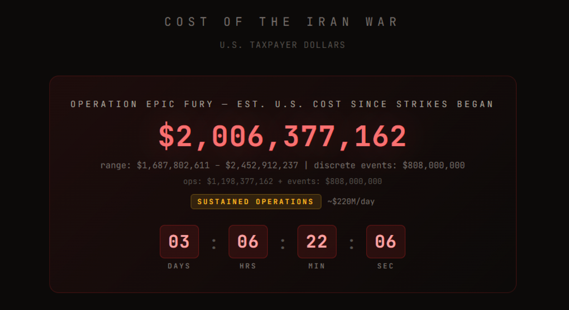 С начала военного конфликта на Ближнем Востоке в сети появился сайт Cost of the Iran War ("Стоимость войны в Иране"), который в режиме реального времени подсчитывает расходы на операцию США против Ирана.