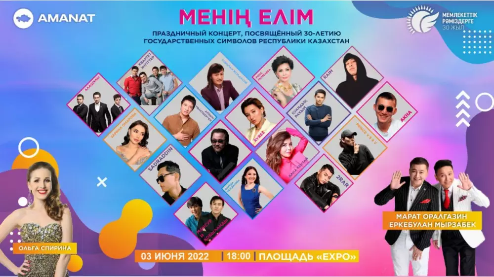 В эту пятницу, 3 июня, в Нур-Султане на территории ЭКСПО состоится праздничный концерт "Менің Елім", посвященный 30-летию со дня принятия Государственных символов Республики Казахстан.