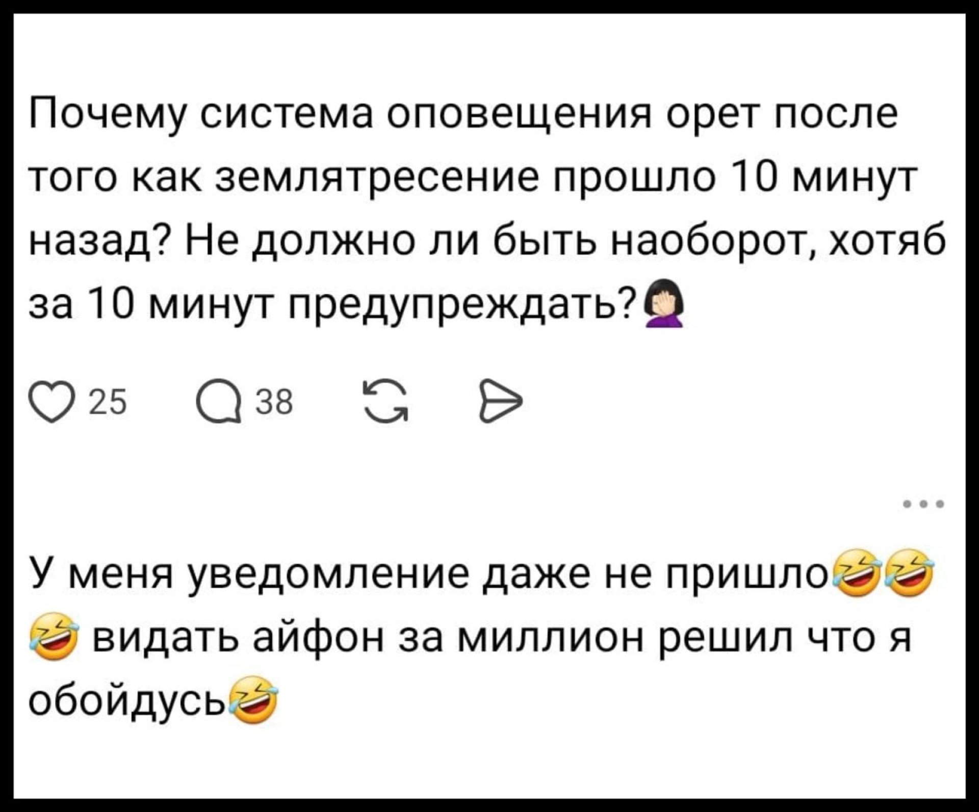 Расчётная интенсивность толчков в Алматы составила три балла. После землетрясения казахстанцы опубликовали в Threads несколько постов о работе системы уведомлений.