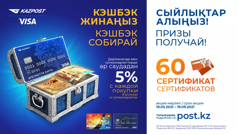- получить кешбэк наличными в рамках программы лояльности в сети партнеров АО "Казпочта".