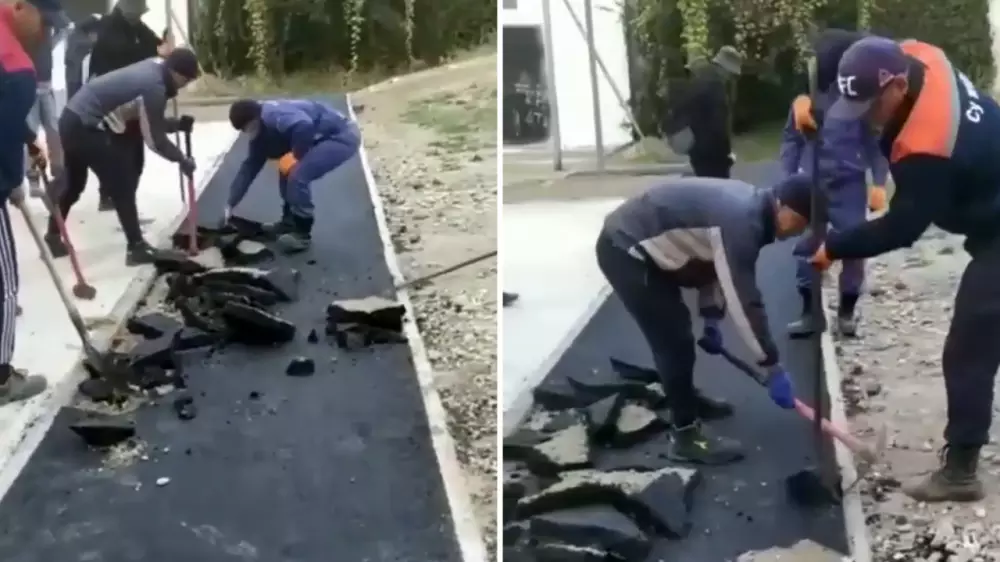 Видео с процессом уничтожения тротуара выложили в социальных сетях. За кадром мужчина говорит, что рабочим не выплатили заработную плату, поэтому они решили выразить протест начальству. Сообщается, что это произошло в микрорайоне Мамыр-3 в Алматы.