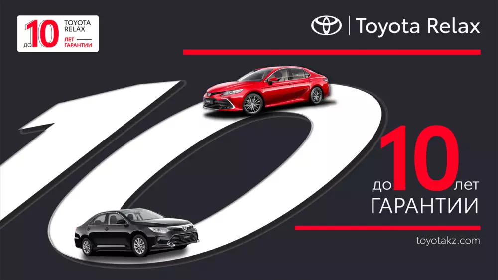 Toyota запустила новую гарантию Toyota Relax для новых автомобилей и автомобилей с пробегом в Казахстане и Кыргызстане. Теперь у владельцев моделей Toyota есть уникальная возможность получить гарантию Toyota Relax до 10 лет.