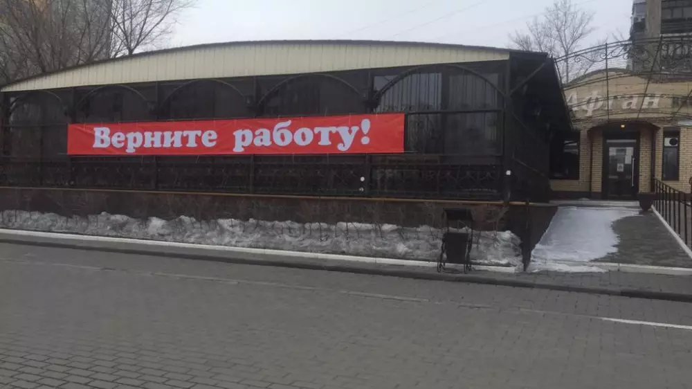Владельцы кафе и ресторанов Темиртау устроили флешмоб. Они развесили на фасадах своих заведений плакаты с надписями "Верните работу!", передает корреспондент Tengrinews.kz.