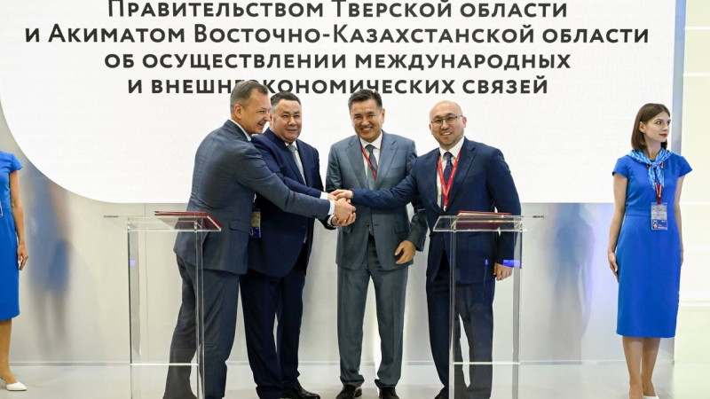 Восточный Казахстан и Тверская область России договорились о сотрудничестве - в числе приоритетных направлений сельское хозяйство, промышленность, культура, образование и туризм. Меморандум подписали аким ВКО Нурымбет Сактаганов и губернатор Тверской области Игорь Руденя на XXVIII Петербургском международном экономическом форуме.
