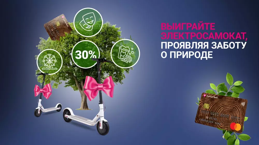 С августа по декабрь среди держателей экокарты Евразийский банк проведет розыгрыш электросамокатов. Для участия необходимо, не приходя в отделение, заказать экокарту и позже проводить транзакции на сумму 10 000 тенге в месяц. Двух победителей будут определять ежемесячно с помощью генератора случайных чисел.