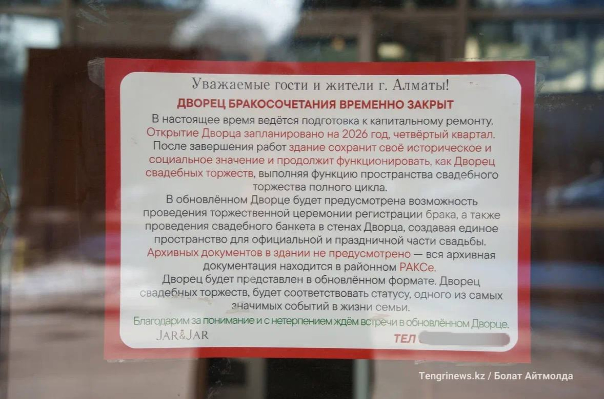 "Ведётся подготовка к капитальному ремонту. Открытие дворца запланировано на четвёртый квартал 2026 года. После завершения работ здание сохранит своё историческое и социальное значение и продолжит функционировать как Дворец свадебных торжеств, выполняя функцию пространства свадебного торжества полного цикла", - отметили в компании.