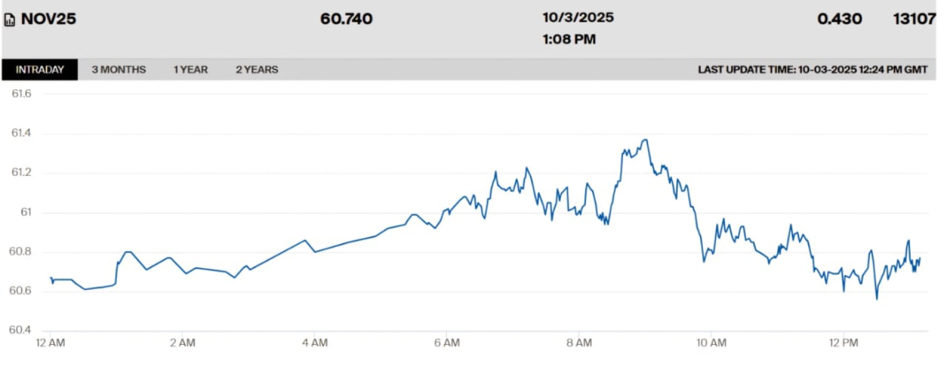 Стоимость ноябрьских фьючерсов на нефть марки WTI увеличилась на 0,43 процента - до 60,74 доллара за баррель.