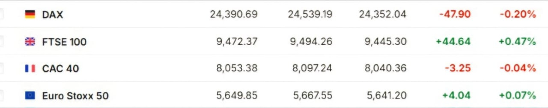 Из основных индексов FTSE 100 (+0,47 процента, Великобритания) благодаря росту акций финансовых и горнодобывающих компаний и Euro Stoxx 50 (+0,07 процента, включает 50 крупнейших и наиболее ликвидных компаний стран еврозоны) на ожиданиях снижения ставок ФРС оказались в плюсе.