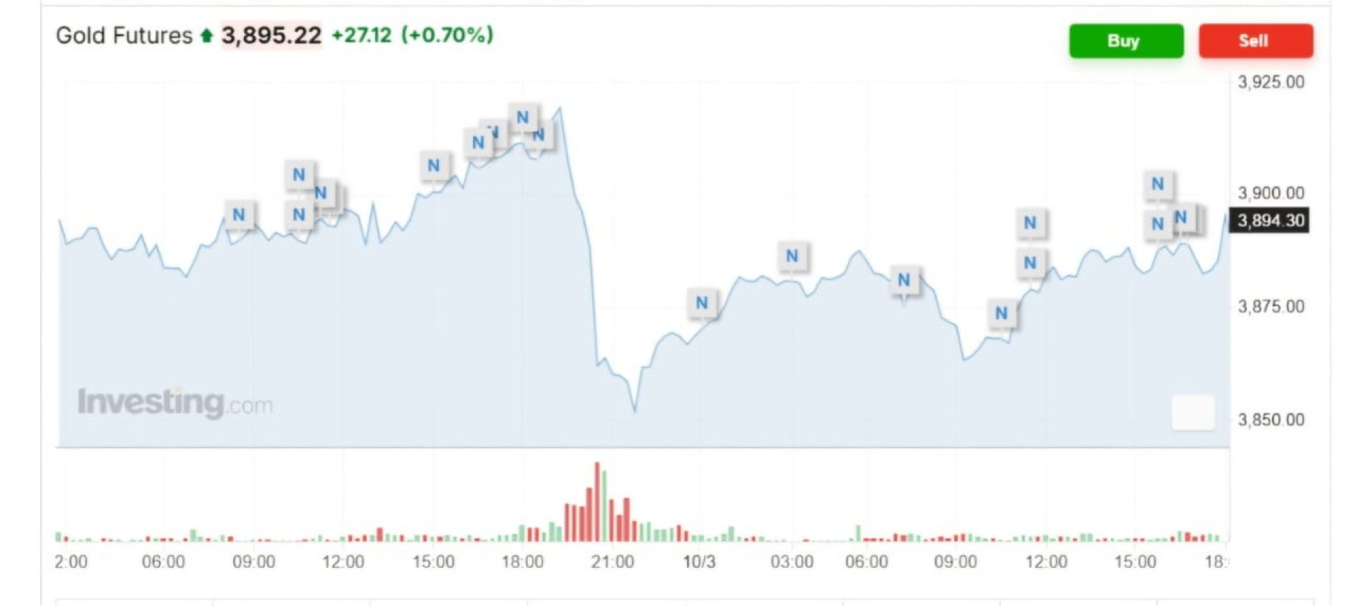 Фьючерс на золото повысился на 0,70 процента - до 3 895,22 доллара за унцию.