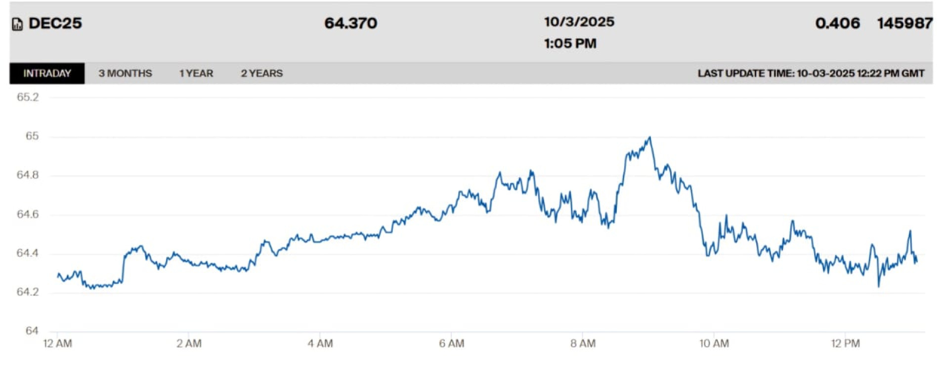 Цена декабрьских фьючерсов на нефть марки Brent на лондонской бирже ICE повысилась на 0,41 процента - до 64,37 доллара за баррель.