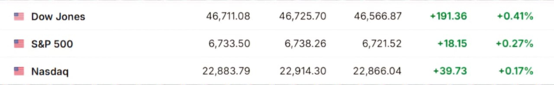 Американские рынки открылись в зеленой зоне, чему способствовали надежды инвесторов на возможное снижение процентных ставок ФРС США. Эти ожидания поддерживают оптимизм на рынках, несмотря на продолжающийся частичный федеральный шатдаун, который задерживает публикацию ключевых экономических данных.