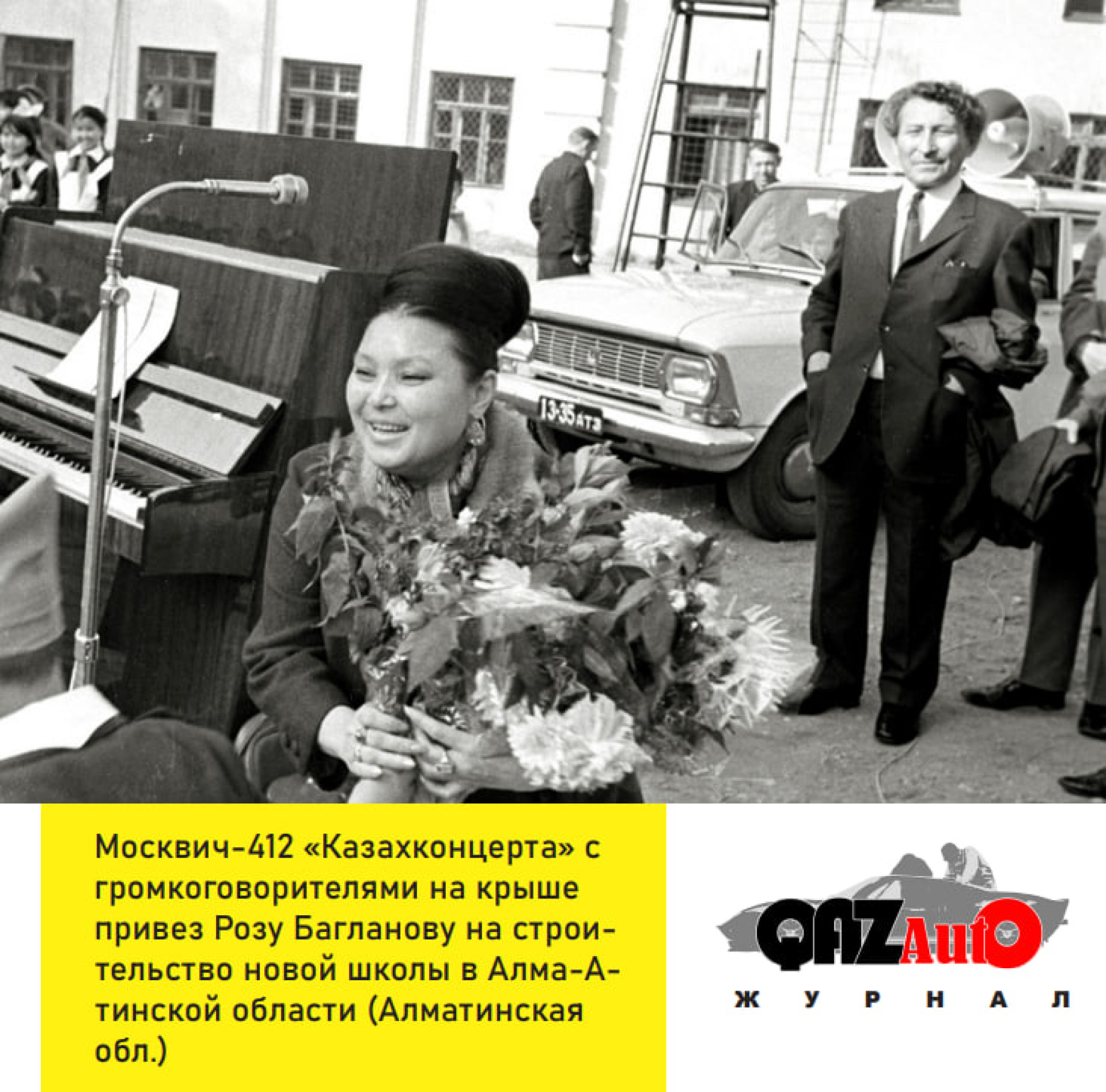 А на ее выступлении перед школьниками во дворе строящейся школы в Алма-Атинской области (Алматинская обл.) попал в кадр служебный автомобиль "Казахконцерта" - "Москвич-412" с громкоговорителями на крыше.