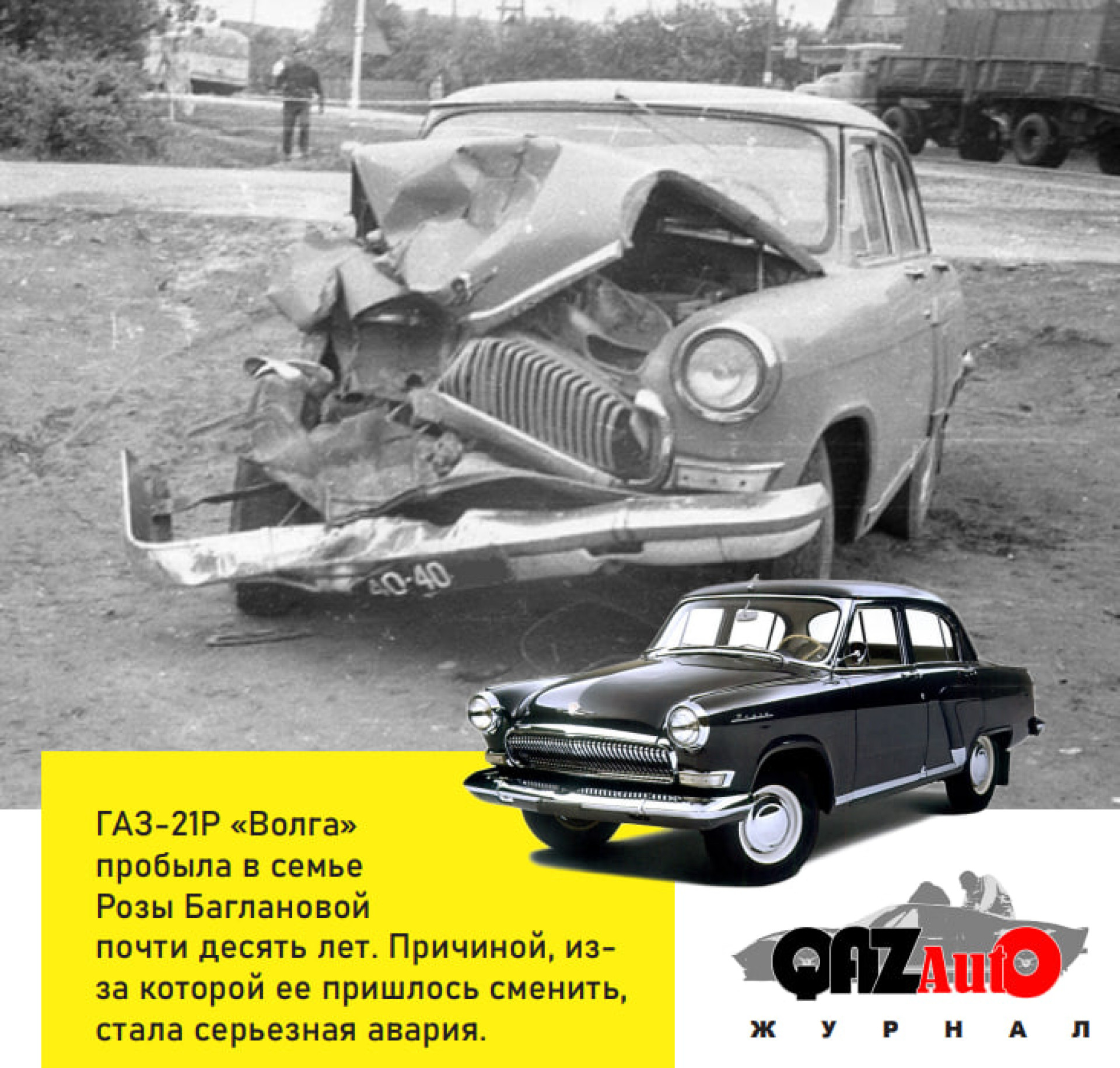 Причиной, по которой первую "Волгу" пришлось сменить, послужила серьезная авария. Муж Розы Тажибаевны, управлявший в тот момент автомобилем, сильно не пострадал. Но сама машина восстановлению уже не подлежала. Пришлось покупать новую!