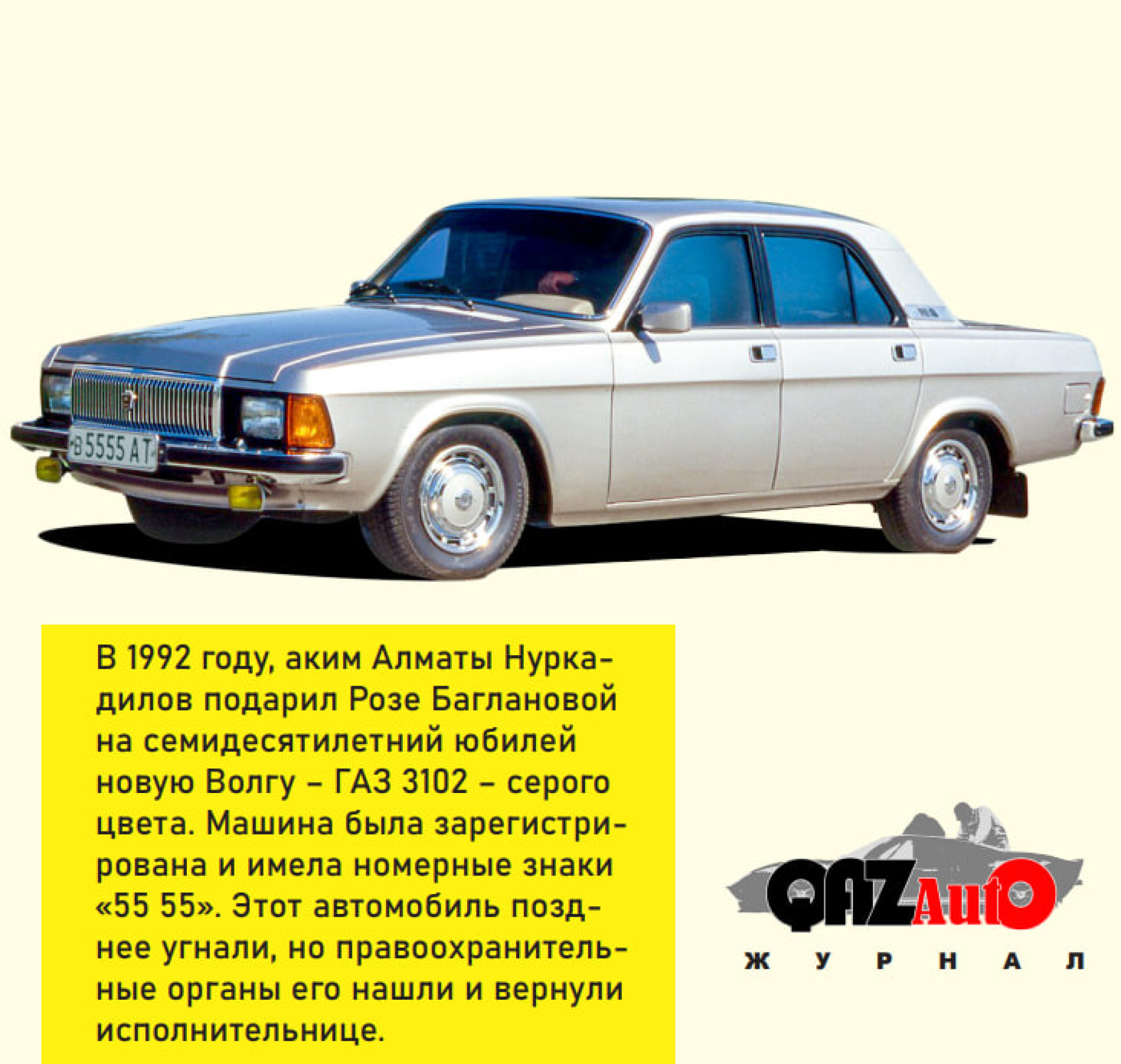 Причем подарок сразу был оформлен и имел номер 55-55. Вручал автомобиль лично аким города Алматы Нуркадилов. "Ноль вторая" всегда считалась "особенной" "Волгой" – собиралась она исключительно вручную и предназначалась для чиновников.