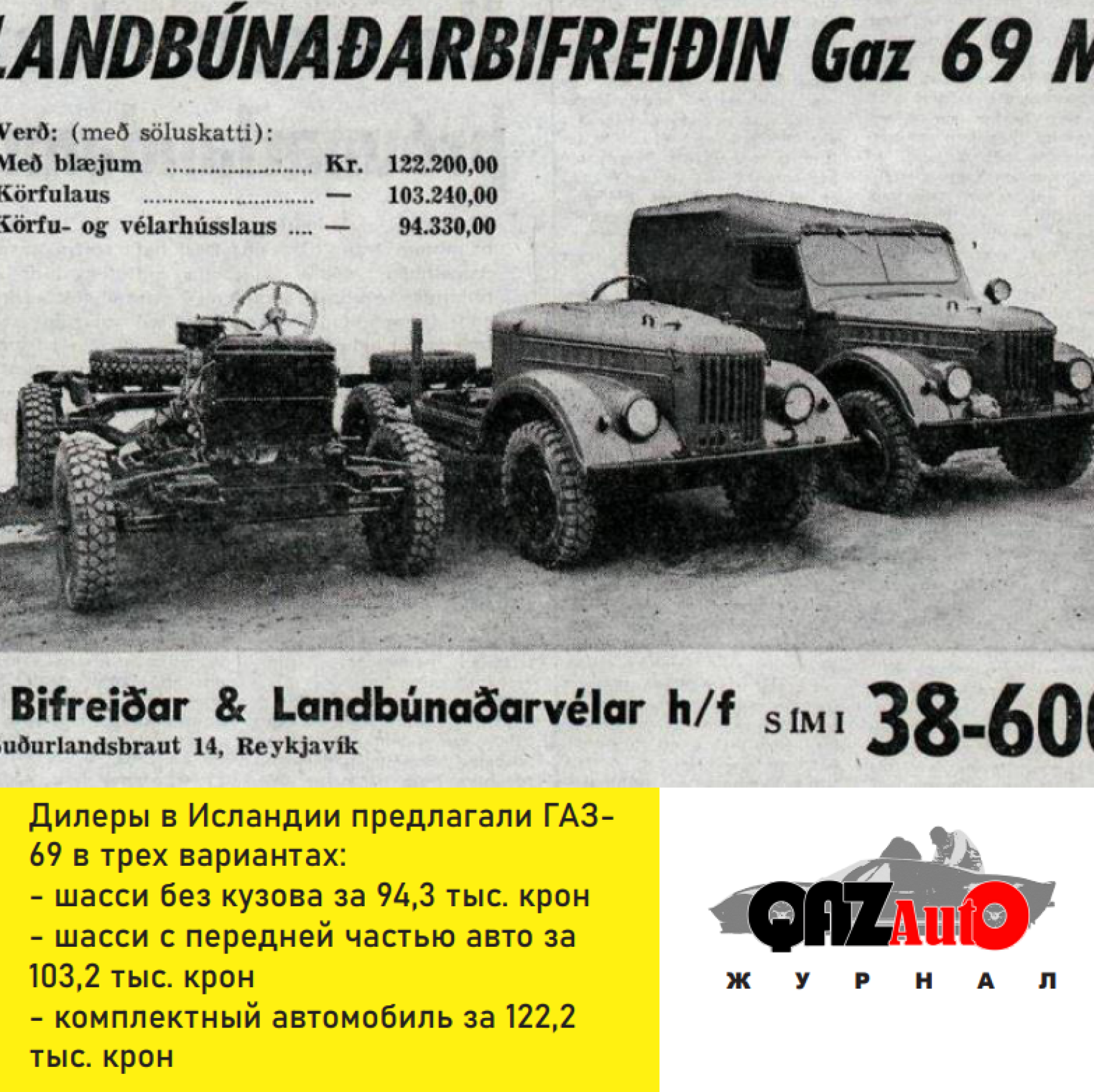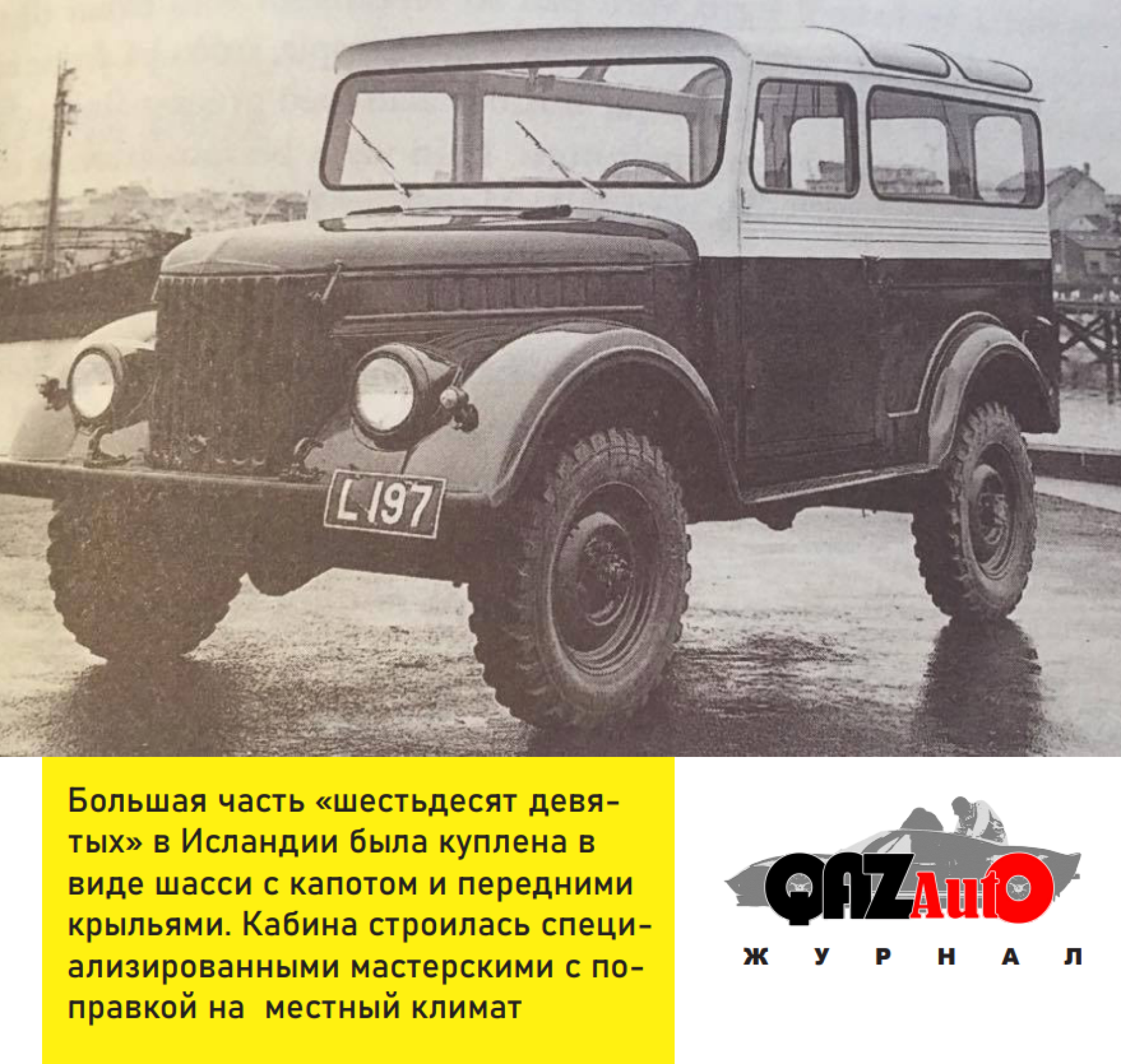 Что касается "шестьдесят девятых газиков" — простая конструкция этих авто абсолютно устраивала исландских покупателей. Единственным минусом машины была разве что крыша, сделанная из брезента. Однако местные дилеры в Исландии решили эту проблему, устанавливая вместо нее жесткую крышу.