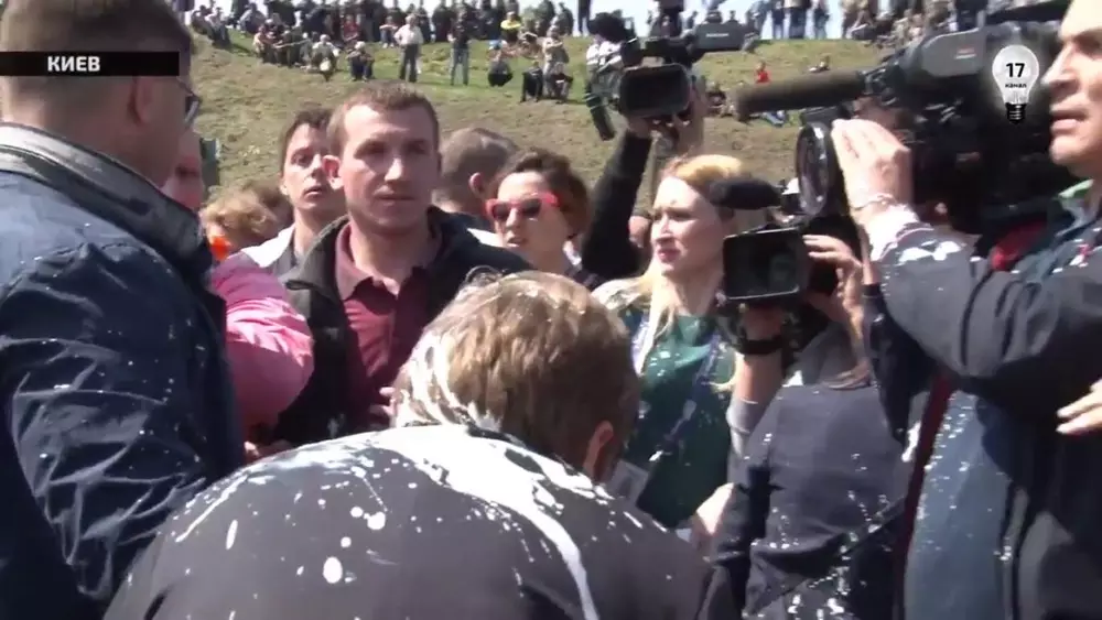 Главного коммуниста Украины облили кефиром и заставили убегать © youtube.com/Громадське Телебачення