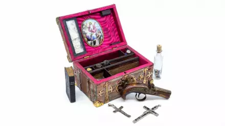 Лот состоит из трех стеклянных бутылок, четок, щипцов, карманного ножа, серебряных лезвий, молитвенника, пистолета, фигурки волка из слоновой кости, распятия и стеклянного флакона с неизвестным содержимым. Старинные предметы помещены в деревянную шкатулку, в которой также есть икона с изображением Христа.