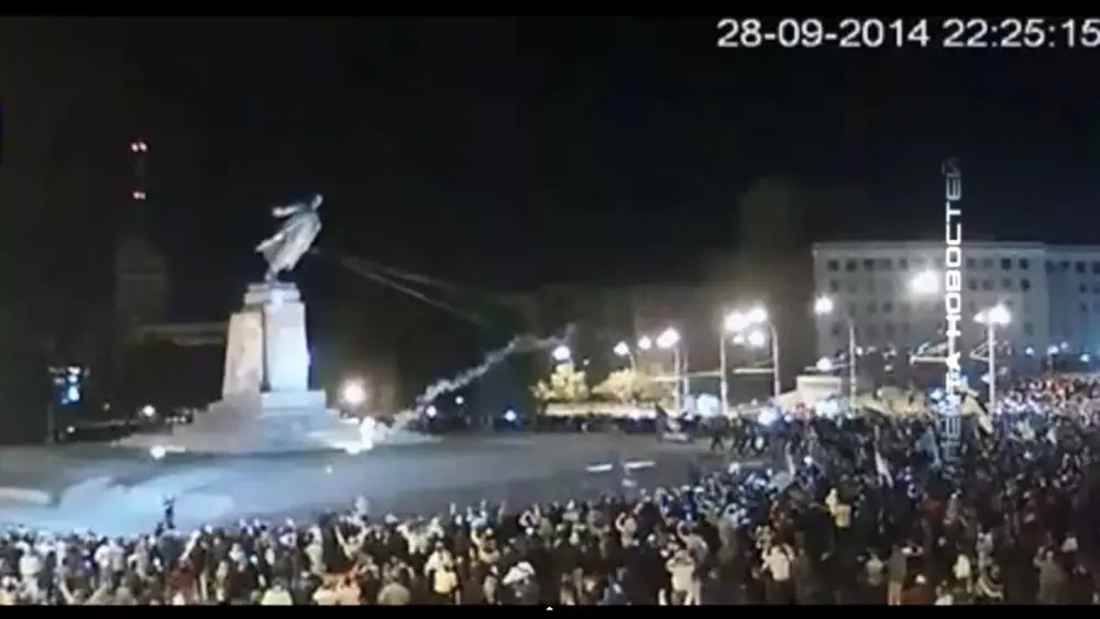 Днем активисты высекли на памятнике коммунистическому вождю слова "Слава Украине!". Первые попытки повалить памятник с помощью тросов закончились неудачей. 20-метровый монумент устоял даже после попытки подпилить ноги вождя. Позднее на площадь была пригнана спецтехника.
