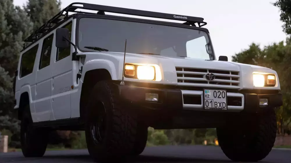 Toyota Mega Cruiser - большой рамный внедорожник, созданный для японской армии и спецслужб. Автомобиль выпускался в период с 1995 по 2001 год для внутреннего рынка, и только 150 вездеходов были предназначены для частных лиц. Особенность экземпляра из Казахстана - левое расположение руля. Для американцев Mega Cruiser - большая редкость, ведь из-за особенностей законодательства в США без ограничений можно импортировать только машины старше 25 лет.