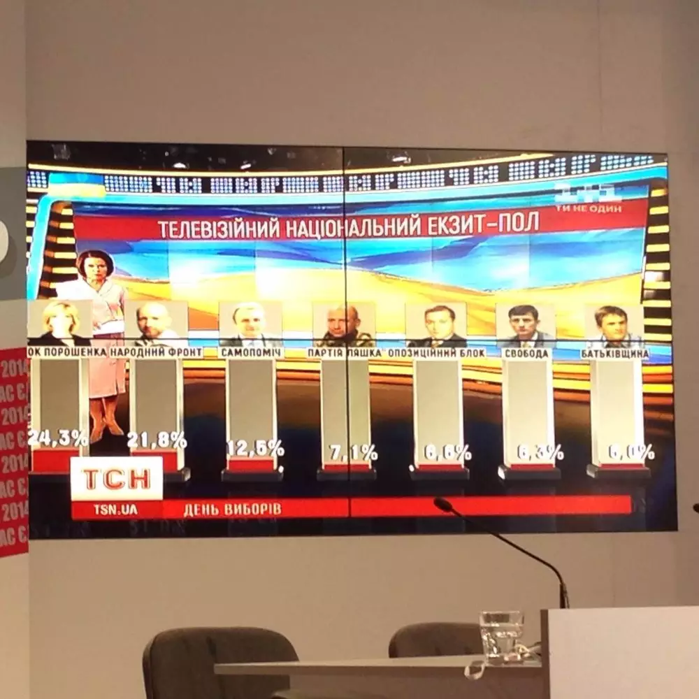 Согласно данным ТНС, Блок Петра Порошенко набирает 24,3 процента, за ним следует "Народный Фронт" премьер-министра Украины Арсения Яценюка с 21,8 процента, на третьем месте партия "Самопомощь" мэра Львова Андрея Садового, которая набирает 12,5 процента. Кроме того, в Верховную Раду проходит "Партия Ляшко" - 7,1 процента, "Оппозиционный блок" (бывшая Партия регионов) - 6,6 процента, партия "Свобода" - 6,3 процента и партия Юлии Тимошенко "Батькивщина" - 6,0 процента.